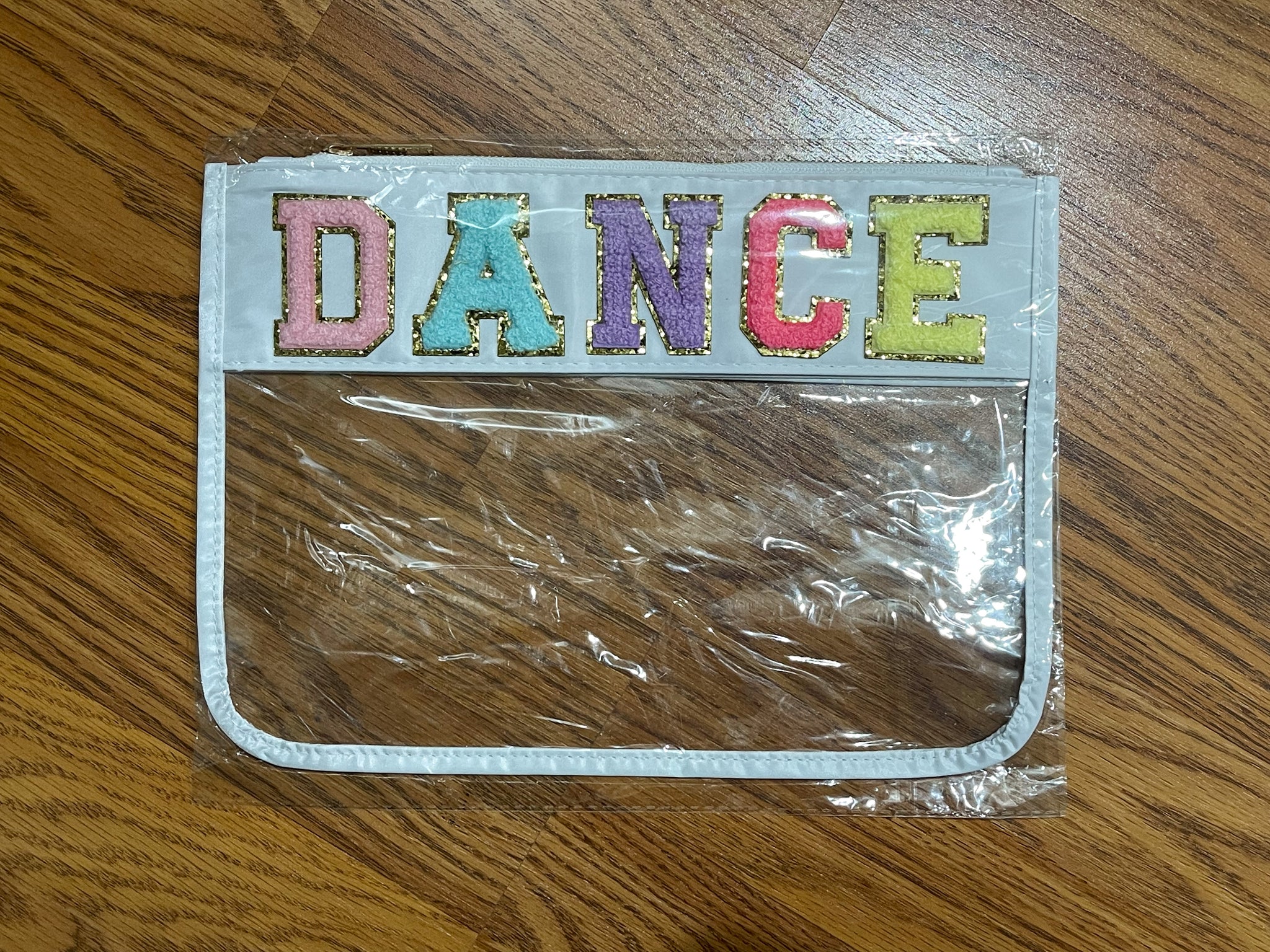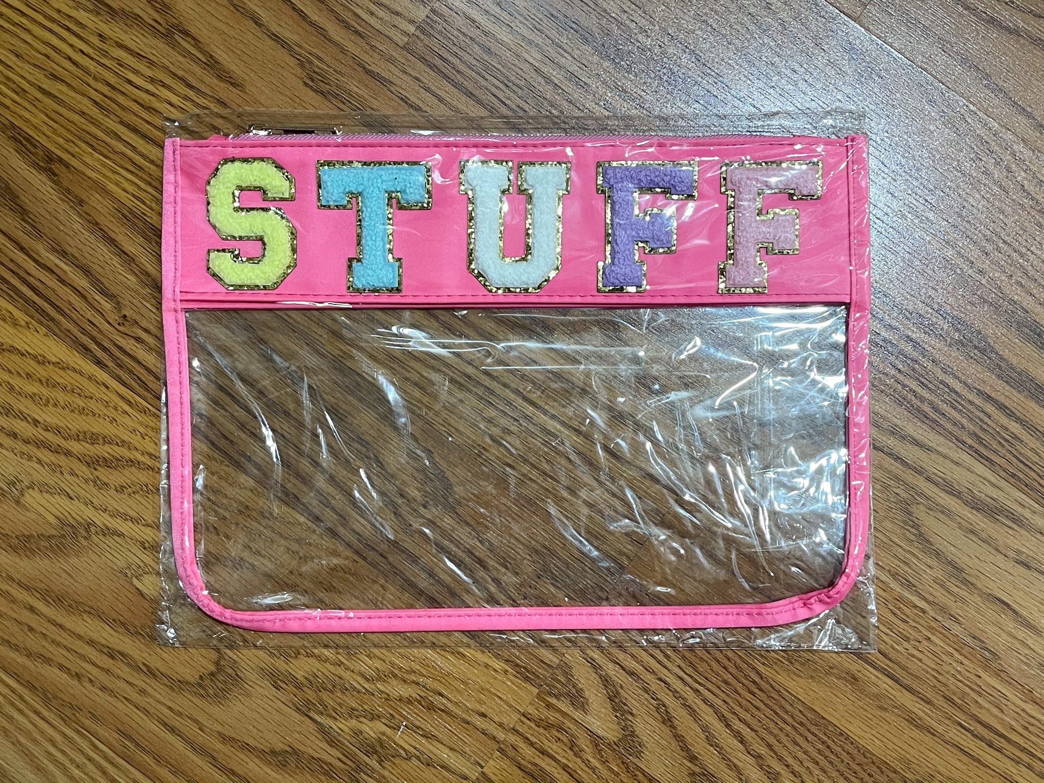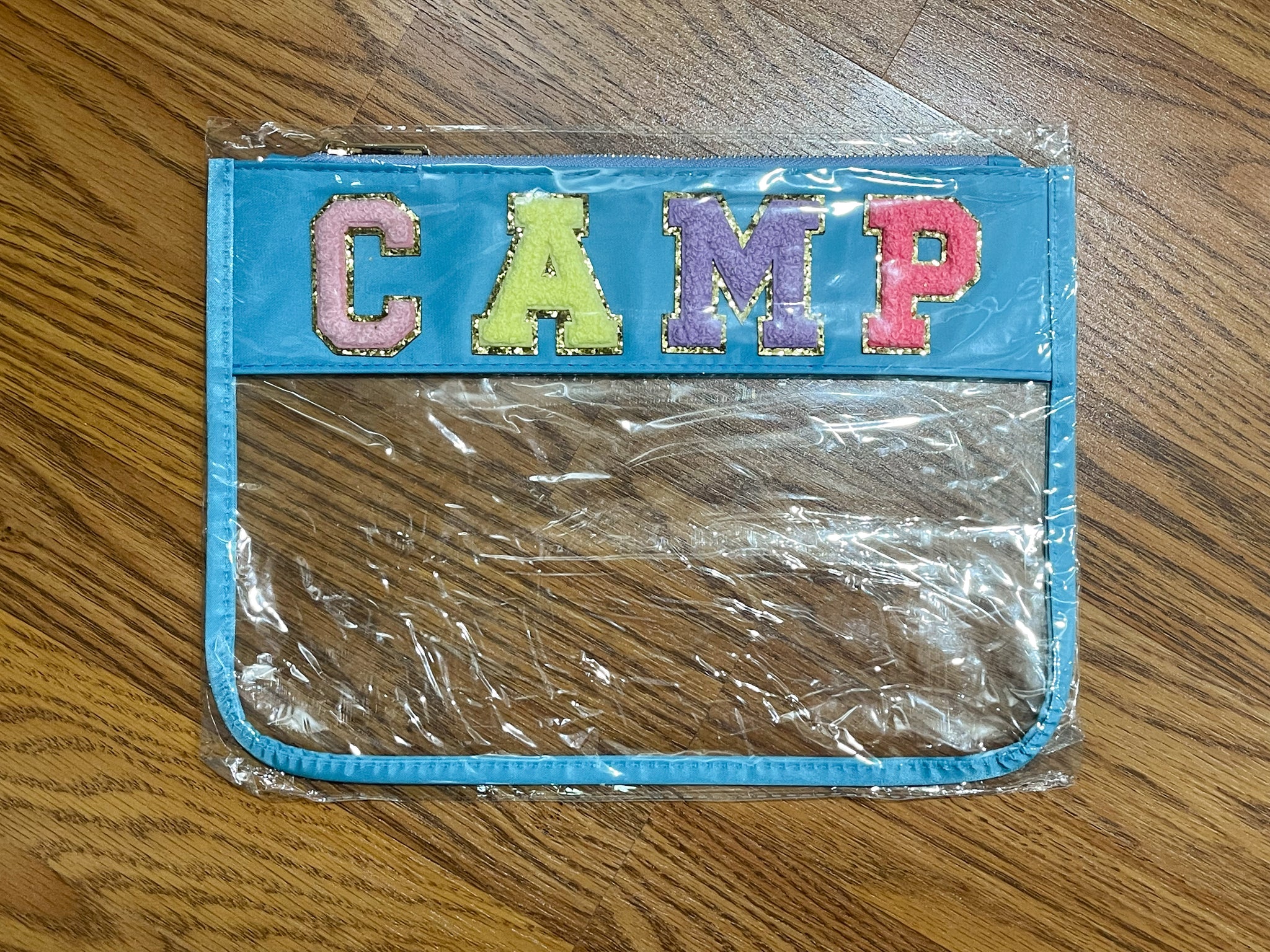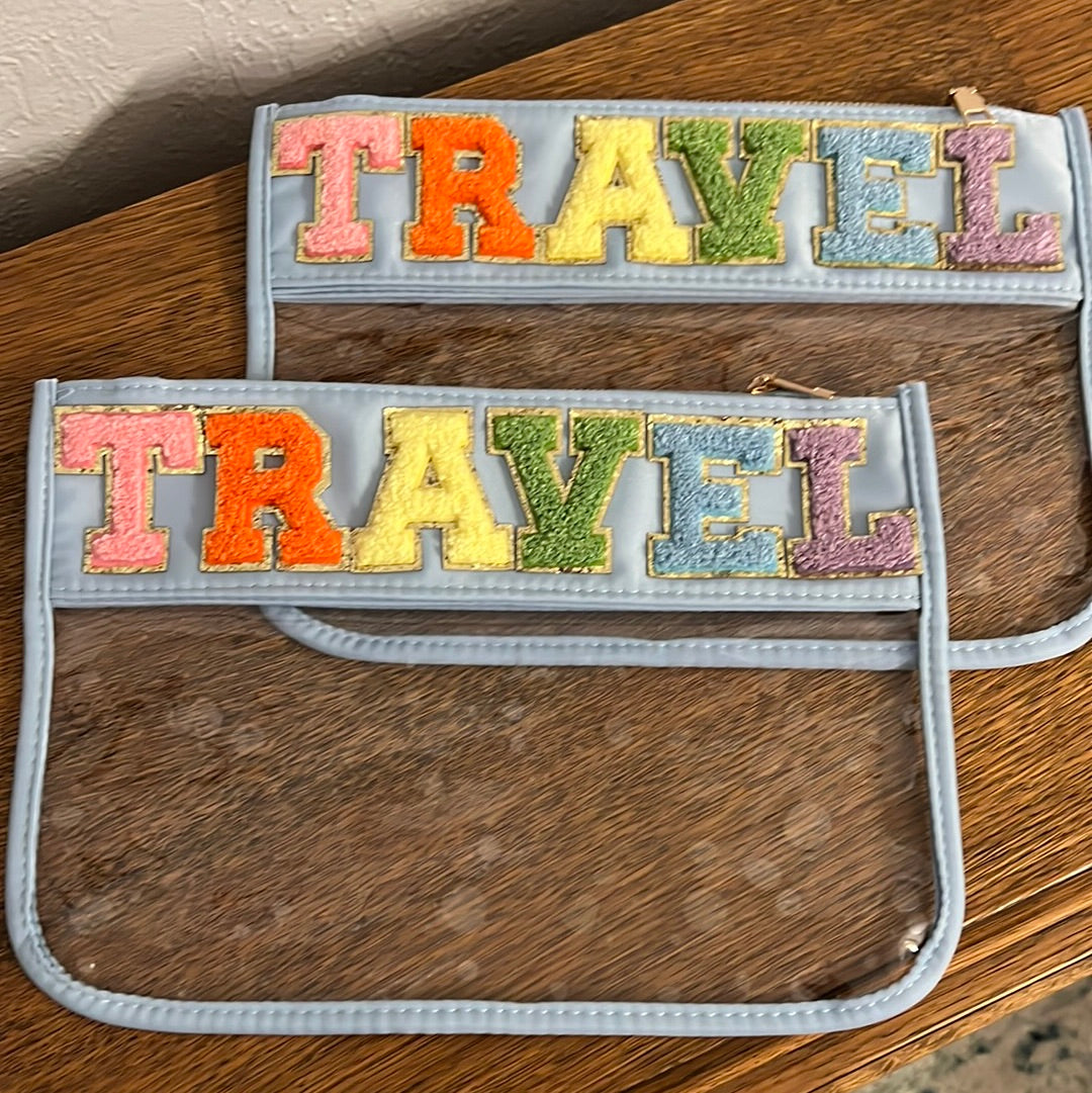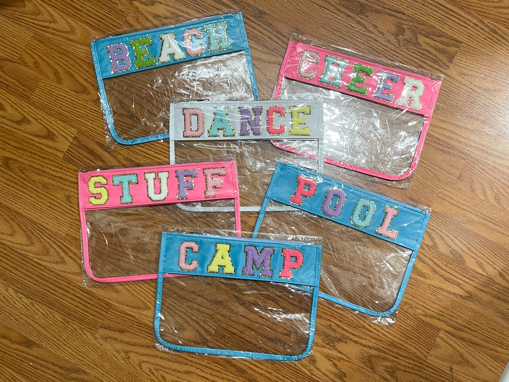 Super cute Varsity Letter Pouches are perfect for toiletries or even a wet bathing suit and sunscreen!